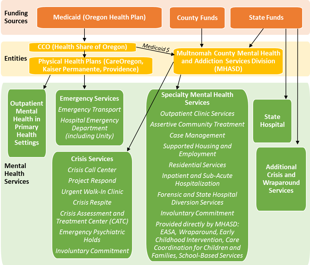 Goal Matrix is based on recommendations offered in the 2018 Mental Health Systems Analysis conducted by the Human Services Research Institute (HSRI). The Goal Matrix is one step in a multi-phase systems change effort, focusing on Multnomah County but complementary to other efforts throughout the state and region.